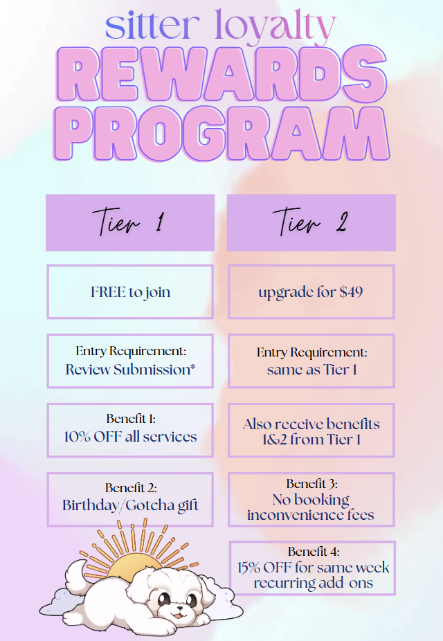We love our furry clients and their humans, too! That’s why we created our Loyalty Sitter Rewards & Discount Program to say thank you for trusting us with your beloved pets.